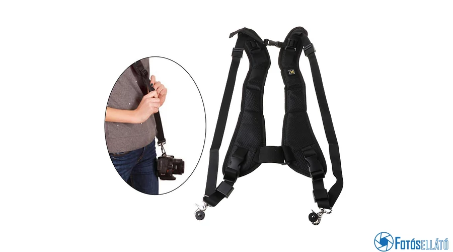 A vállpánt segítségével két kamerát is gond nélkül hordozhatunk. Kényelmesen és biztonságosan válhatunk fényképezőgépet. A hordszíj több ponton állítható, így kényelmesen, a megszokott magasságban tárolhatja fényképezőgépét.