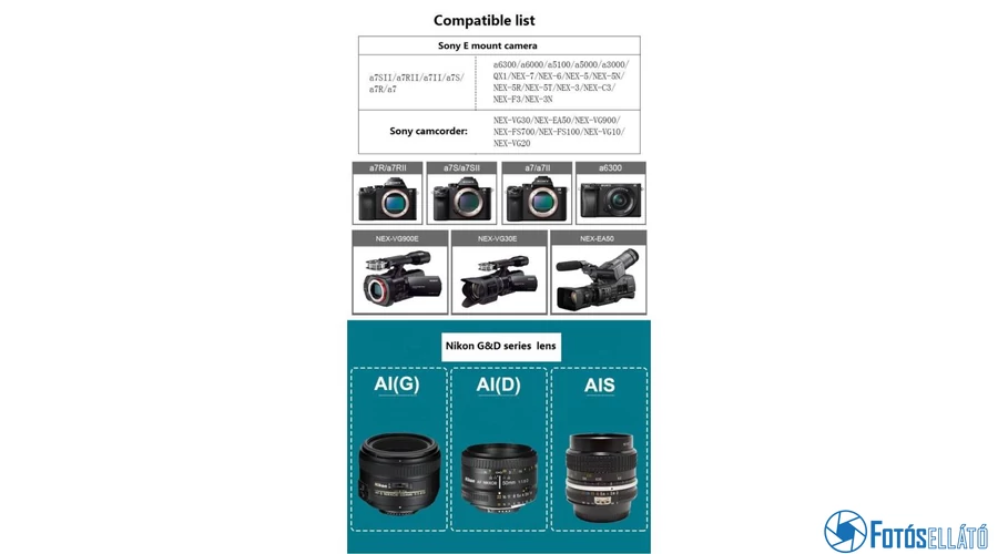 | Kompatibilis fényképezőgépek | Sony E sorozatú fényképezőgépek |